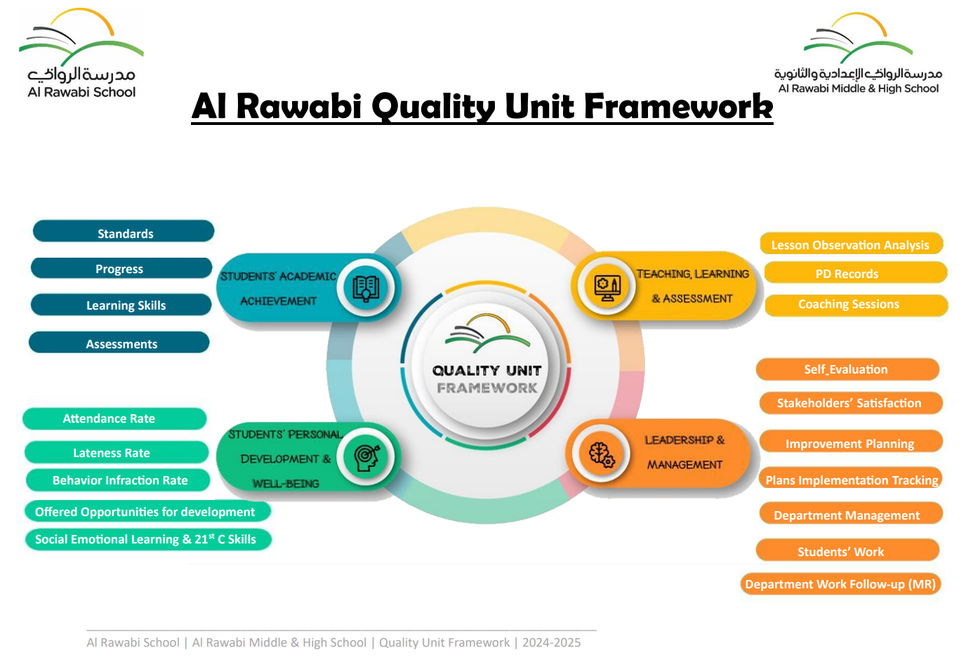 The Quality Unit promotes a quality culture among all stakeholders, creating a school ethos characterized by trust, commitment, collaboration, quality-mindedness, enthusiasm for continuous improvement, constant learning and as a result, a working culture that sustains Al-Rawabi success and existence.