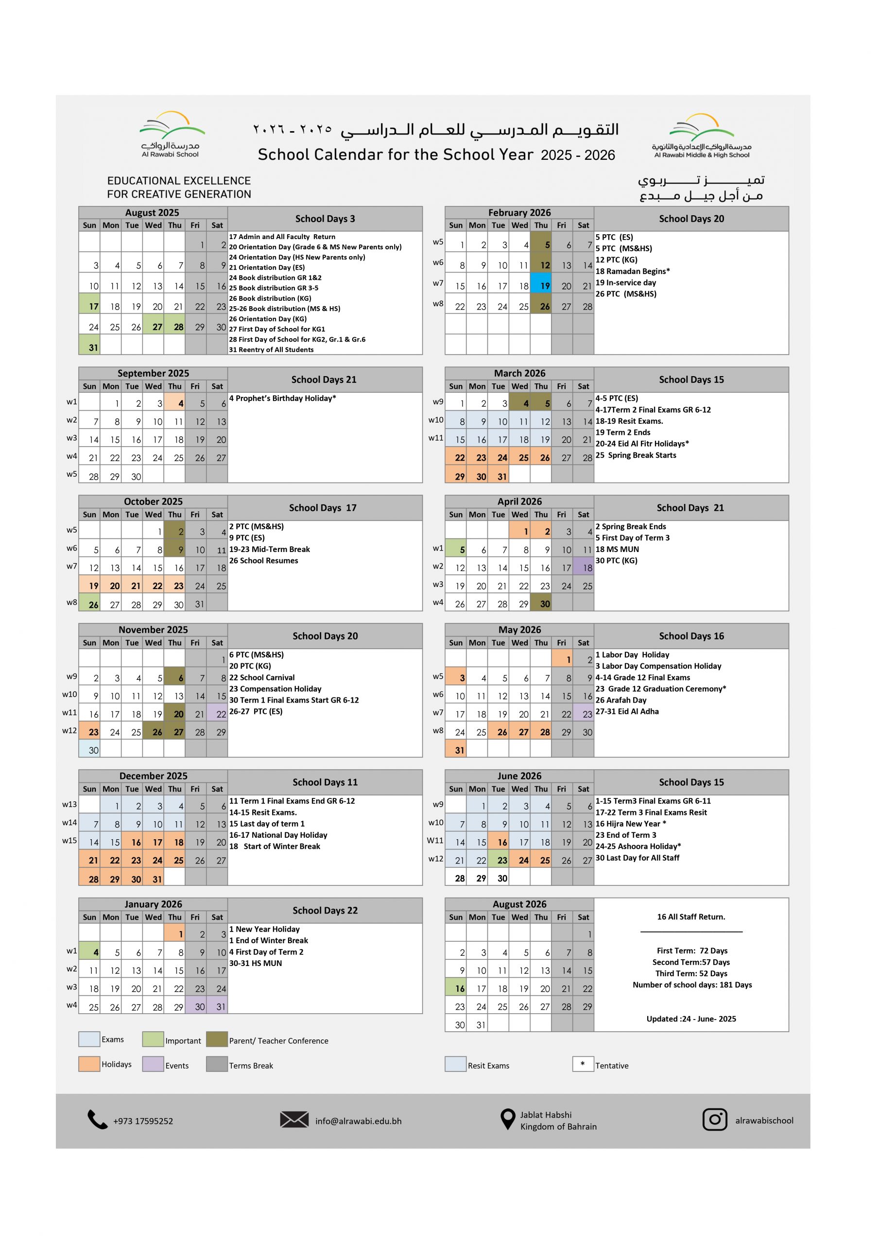 AL RAWABI SCHOOL was established in 1997 with 25 Kindergarten students in a small villa in Grnata, Kingdom of Bahrain. Today, AL RAWABI SCHOOL provides high quality education at an affordable cost for nearly two thousand students. We believe that the aim of education should be to promote a balanced development of the mental, emotional, physical, social, moral and spiritual aspects of our children.